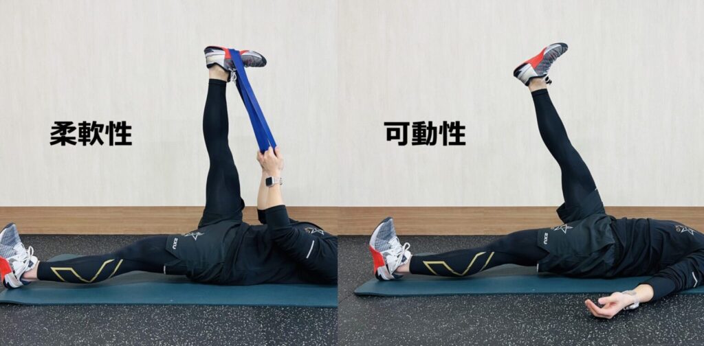 柔軟性は、動く範囲のこと言います。画像のように、物や人のサポートがあると動かせる範囲はこれに当たります。可動性は、自分の意思で動かすことのできる範囲のことを言います。(画像右のような形)